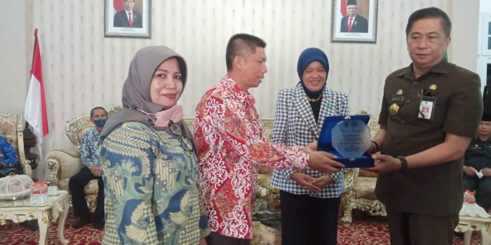 Ketua FBS Berau Sultan, didampingi Kabid Kesmas Dinkes Berau Suhartini, memberikan cinderamata ke Sekkab Barru. (Helda/Dimensinews)