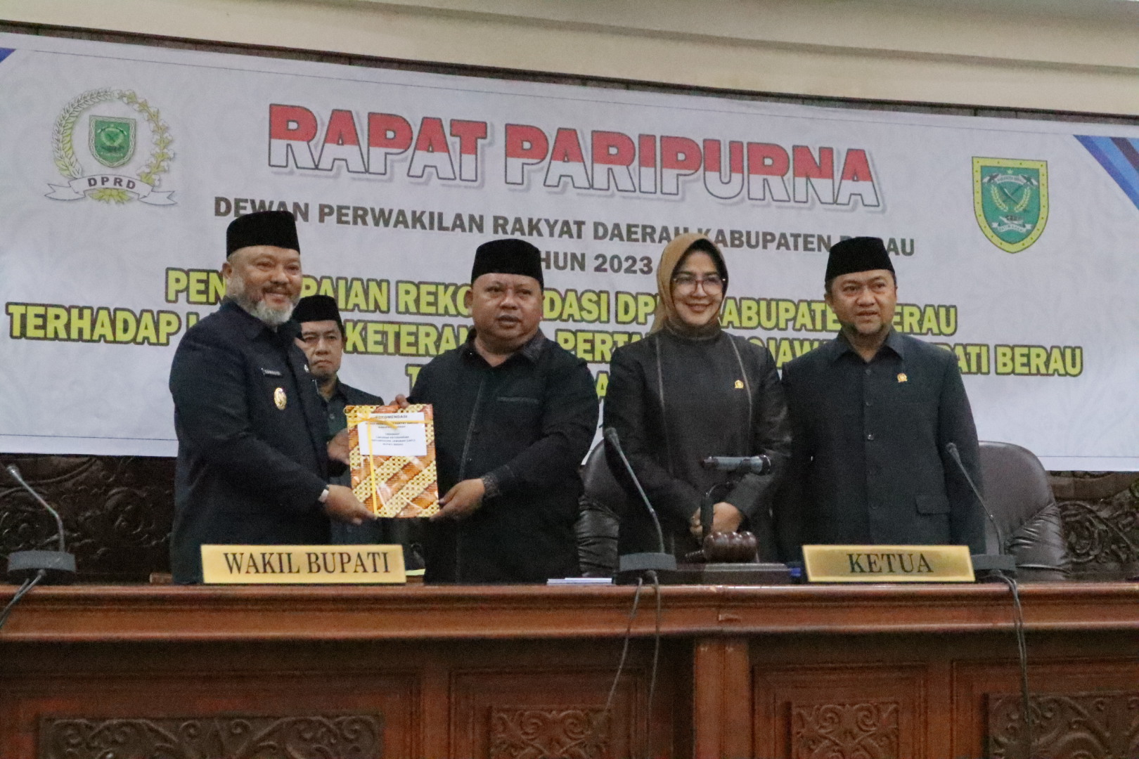 Ketua DPRD Berau Madri Pani menyerahkan berkas rekomendasi atas LKPj Bupati Tahun Anggaran 2022 kepada Wakil Bupati Berau, Gamalis dalam paripurna. (Ria/Dimensinews)