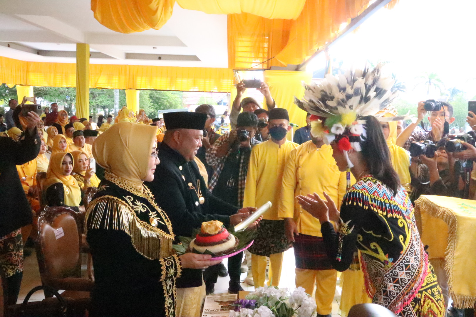 Bupati Berau Sri Juniarsih Mas dan Wabup Berau Gamalis, menerima Puncak Rasul dalam peringatan Hari Jadi ke-70 Kabupaten Berau dan Hari Jadi ke-213 Kota Tanjung Redeb. (Ria/Dimensinews)