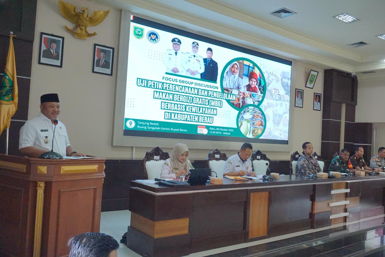 BERAU, DIMENSINEWS – Pemerintah Kabupaten (Pemkab) Berau terus menunjukkan komitmennya dalam mendukung program Makan Bergizi Gratis (MBG). Melalui Focus Group Discussion (FGD) bertema “Uji Petik Perencanaan dan Pengelolaan MBG Berbasis Kewilayahan”, Satuan Tugas Percepatan Program MBG Kabupaten Berau menggelar pertemuan strategis di Ruang Rapat Sangalaki, Rabu (8/10/2025).