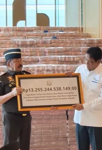 Penyerahan secara simbolis uang belasan triliun rupiah tersebut dilakukan Jaksa Agung RI, ST Burhanuddin kepada Menteri Keuangan Purbaya Yudhi Sadewa disaksikan Presiden Prabowo Subianto di Gedung Utama Kejagung, Jakarta, Senin, (20/10/2025).