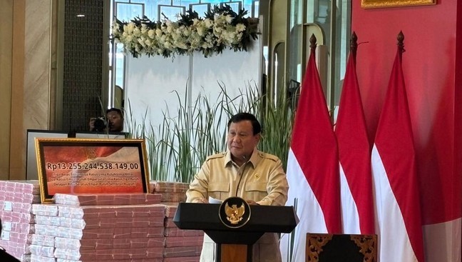 “Hari ini kita bisa hadir di Kejaksaan Agung untuk menghadiri suatu acara walaupun simbolis tapi acara penting, yaitu penyerahan uang pengganti kerugian negara sebesar 13 miliar, eh triliun, sori, sori, nggak kita bayangkan uang seperti itu, dua ratus lima puluh lima miliar, dua ratus empat puluh empat juta, lima ratus tiga puluh delapan ribu, seratus empat puluh sembilan rupiah,” kata Prabowo di Kejaksaan Agung, Jakarta Selatan, Senin (20/10/2025).