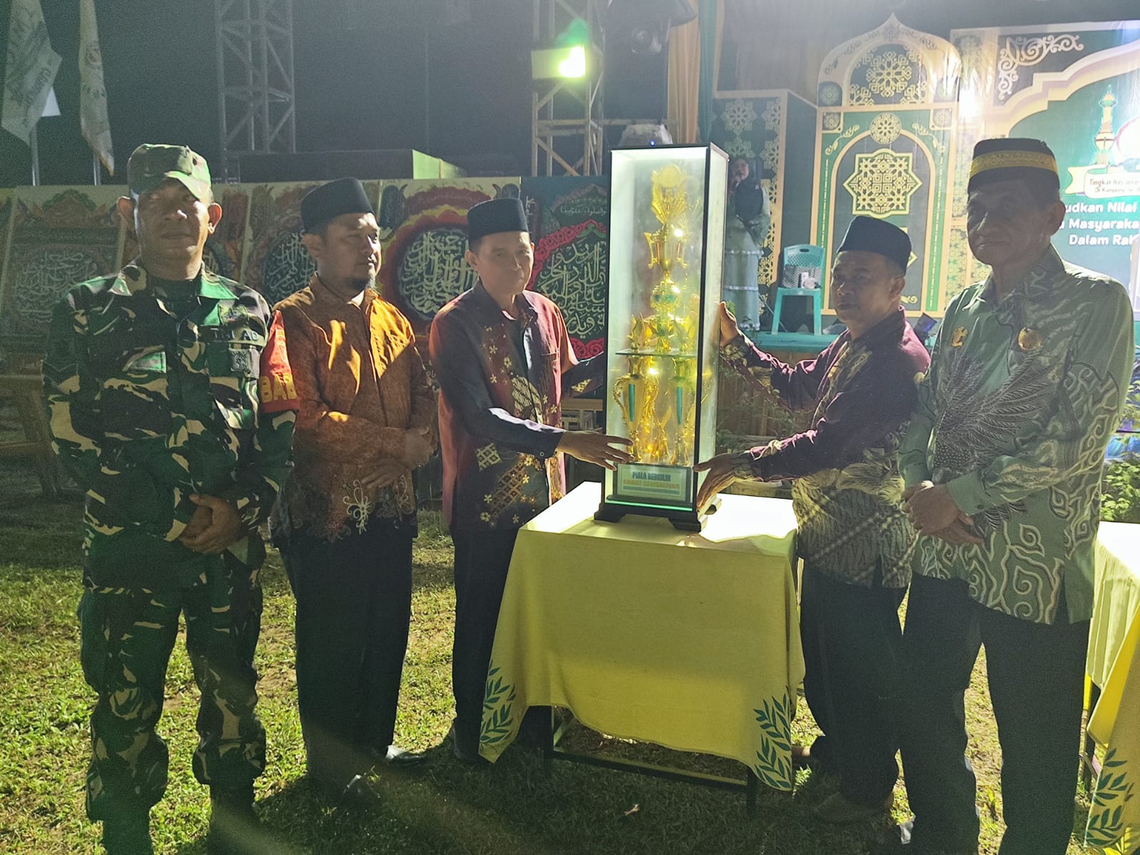 Camat Sambaliung, Ahmad Juhri usai menyerahkan piala bergilir yang pertama kepada Pj Kepala Kampung Sei Bebanir Bangun, Musrin, pada penutupan MTQ ke 55 Sambaliung di Kampung Semni Bebanir Bangun. foto dok Dimensinews.id
