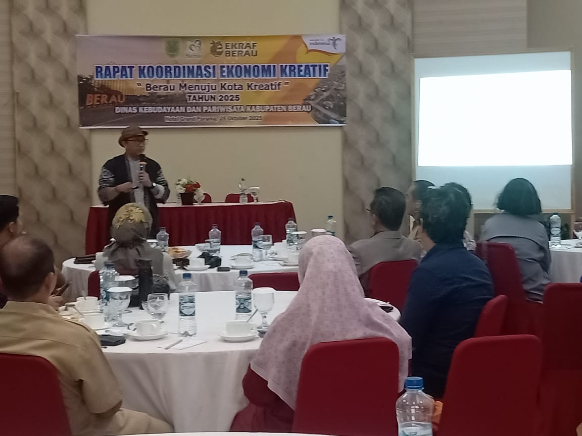 TANJUNG REDEB, DIMENSINEW – Pemerintah Kabupaten Berau melalui Dinas Pariwisata dan Kebudayaan (Disparbud), Selasa (28/10/2025) menggelar Rapat Koordinasi (Rakor) Ekonomi Kreatif (Ekraf) bertema “Berau Menuju Kota Kreatif”. Rakor yang dibuka di Ballroom Hotel Grand Parama ini menyoroti pentingnya penentuan arah yang jelas dan tata kelola yang kuat dalam memajukan Ekraf daerah.