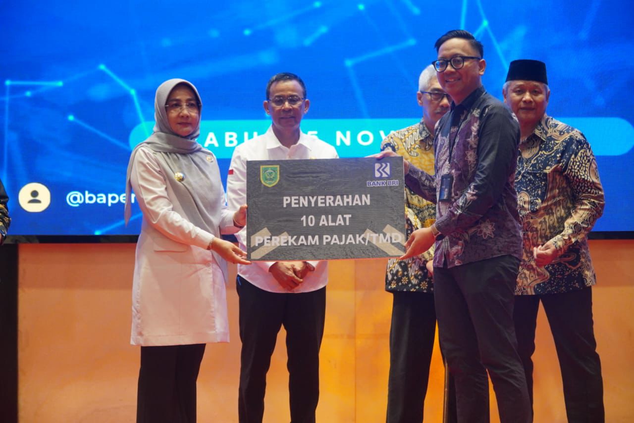 BUPATI Berau Sri Juniarsih Mas menyerahkan alat perekam pajak kepada pengusaha. foto dok Kominfo
