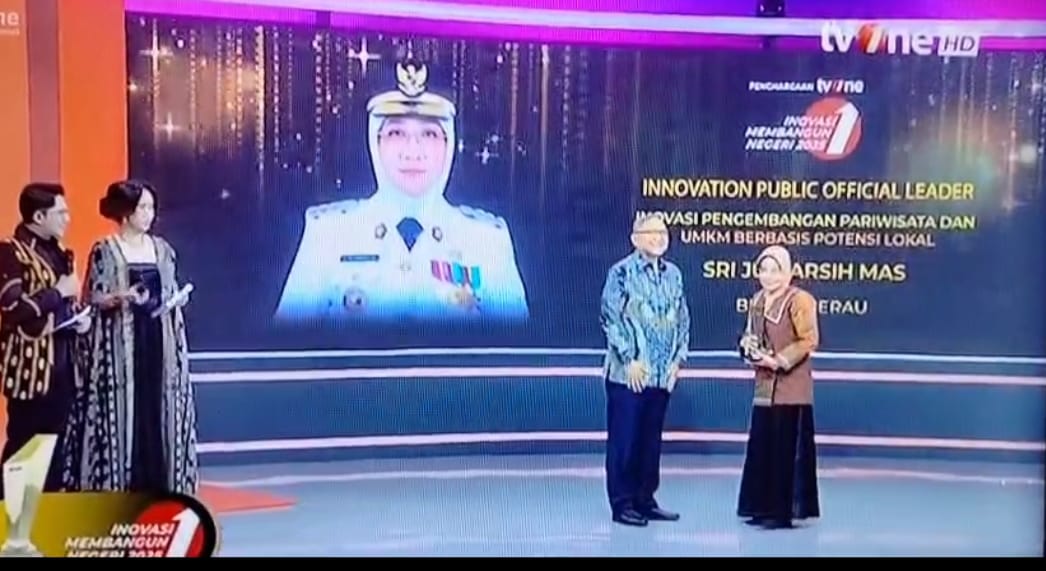BUPATI Berau Sri Juniarsih Mas menerima penghargaan Innovation for Public Leader dalam ajang Inovasi Membangun Negeri 2025 yang diselenggarakan oleh TvOne. foto tangkapan layar TV one.