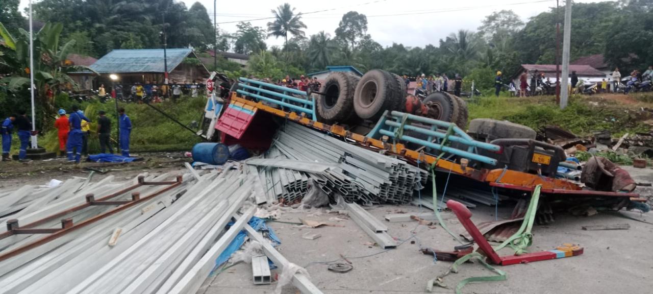 TRUCK trailer 10 roda yang mengangkut plat baja dan seng mengalami kecelakaan rem (rem blong). ist