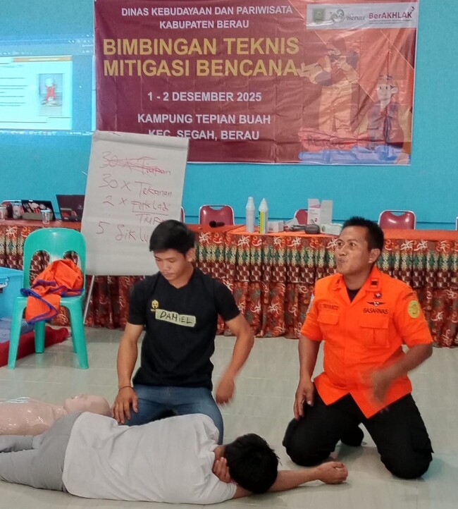 SEGAH, DIMENSINEWS— Dinas Kebudayaan dan Pariwisata (Disbudpar) Kabupaten Berau meningkatkan kesiapsiagaan pengelola destinasi wisata air di Kecamatan Segah. Langkah ini diwujudkan melalui Bimbingan Teknis (Bimtek) Mitigasi Bencana yang berlangsung selama dua hari penuh, pada 1-2 Desember 2025, di Aula Kantor Pemerintah Kampung Tepian Buah.
