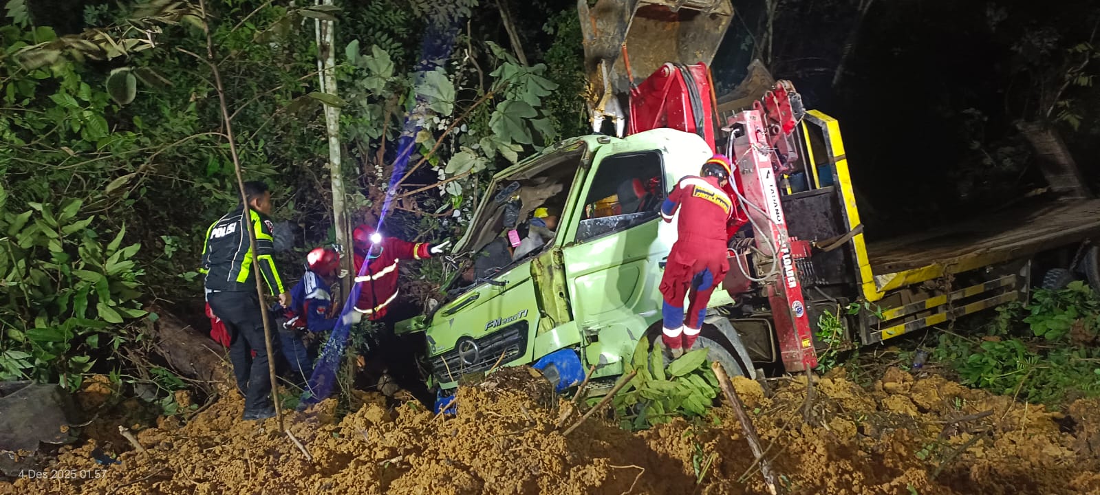 (BPBD) Kabupaten Berau mengevakuasi jenazah yang terjebak dalam Truck Towing yang mengalami kecelakaan di Jalan poros Lamin, Kecamatan Teluk Bayur. Pada Rabu malam (3/12/2025). foto BPBD
