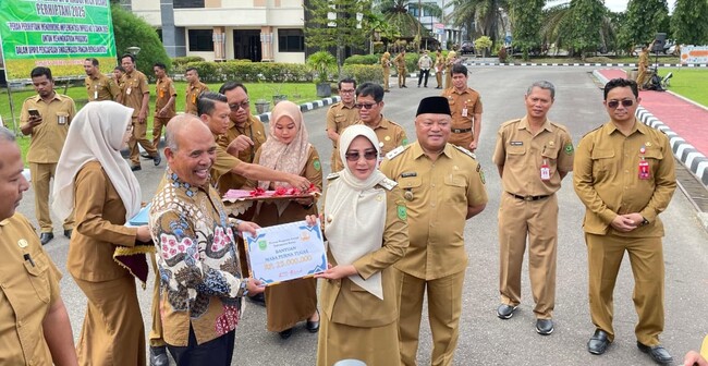 PENYERAHAN bantuan masa purna tugas kepada mantan Kepala Dinas Kebudayaan dan Pariwisata serta mantan Kepala BPKSDM, oleh Bupati Berau pada apel Apel Gabungan perdana ASN di lingkup Setda Berau pada Senin (5/1/2026). foto Toni Arman Dimensinews.id