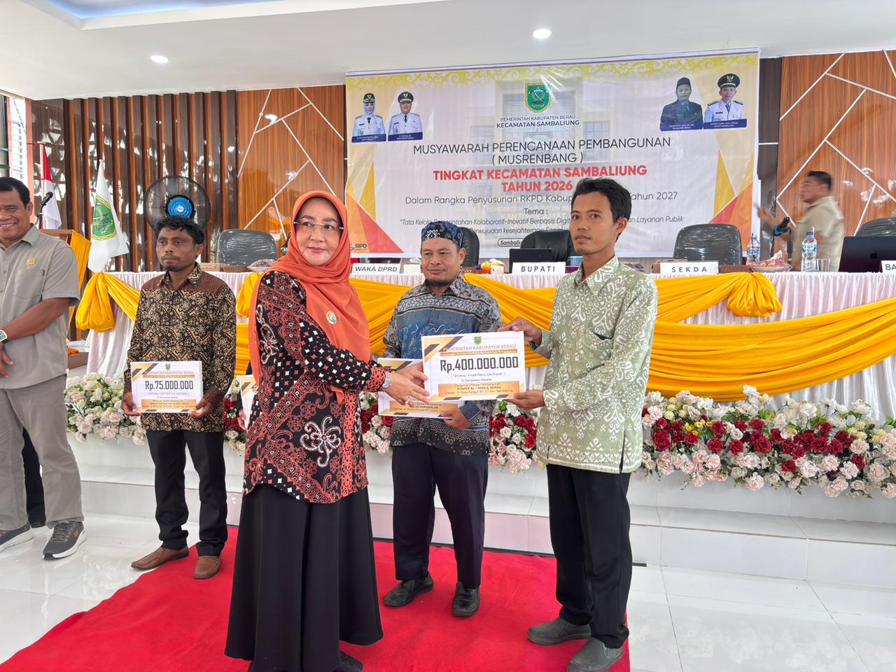 Penyerahan bantuan hibah kepada rumah ibadah dan pondok pesantren oleh Bupati Berau, Sri Juniarsih Mas, di sela-sela Musyawarah Perencanaan Pembangunan (Musrenbang) Kecamatan Sambaliung. foto Kominfo Berau