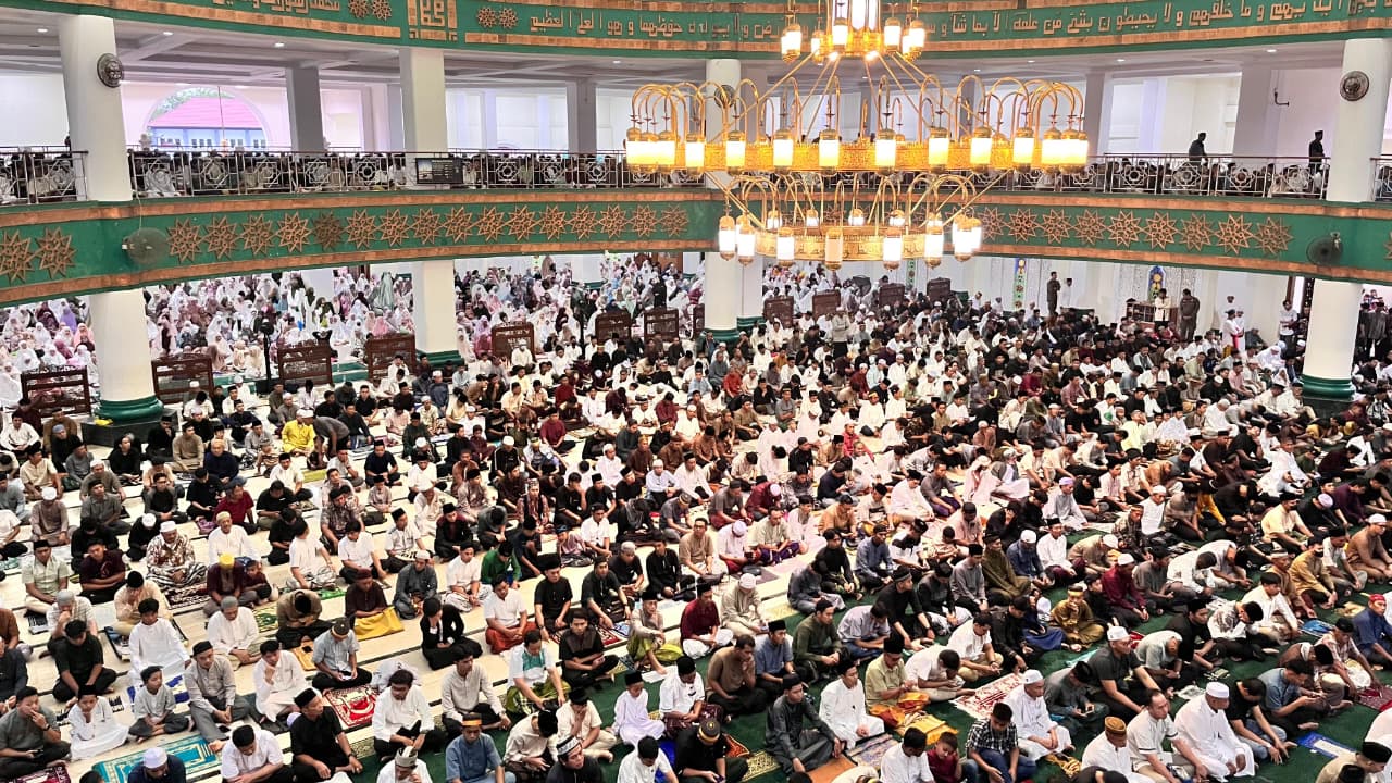 Ribuan jemaah yang memadati Masjid agung Baitul Hikmah, Pada Sabtu pagi (21/3/2026). Sejak pukul 06.00 WITA para jamaah secara antusias berbondong-bondong datang untuk melaksanakan Salat Idul Fitri 1447 Hijriyah (H). foto Toni Arman Dimensinews.id