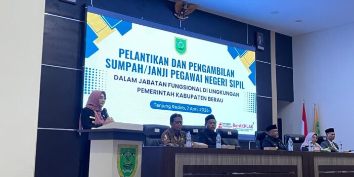 TANJUNG REDEB, DIMENSINEWS – Pemerintah Kabupaten Berau resmi melantik 313 Aparatur Sipil Negara (ASN) dalam jabatan fungsional. Prosesi pengambilan sumpah dan janji PNS tersebut dipimpin langsung oleh Bupati Berau, Sri Juniarsih Mas, di Ruang Rapat RPJPD Bapelitbang, Selasa (7/4/2026) malam.