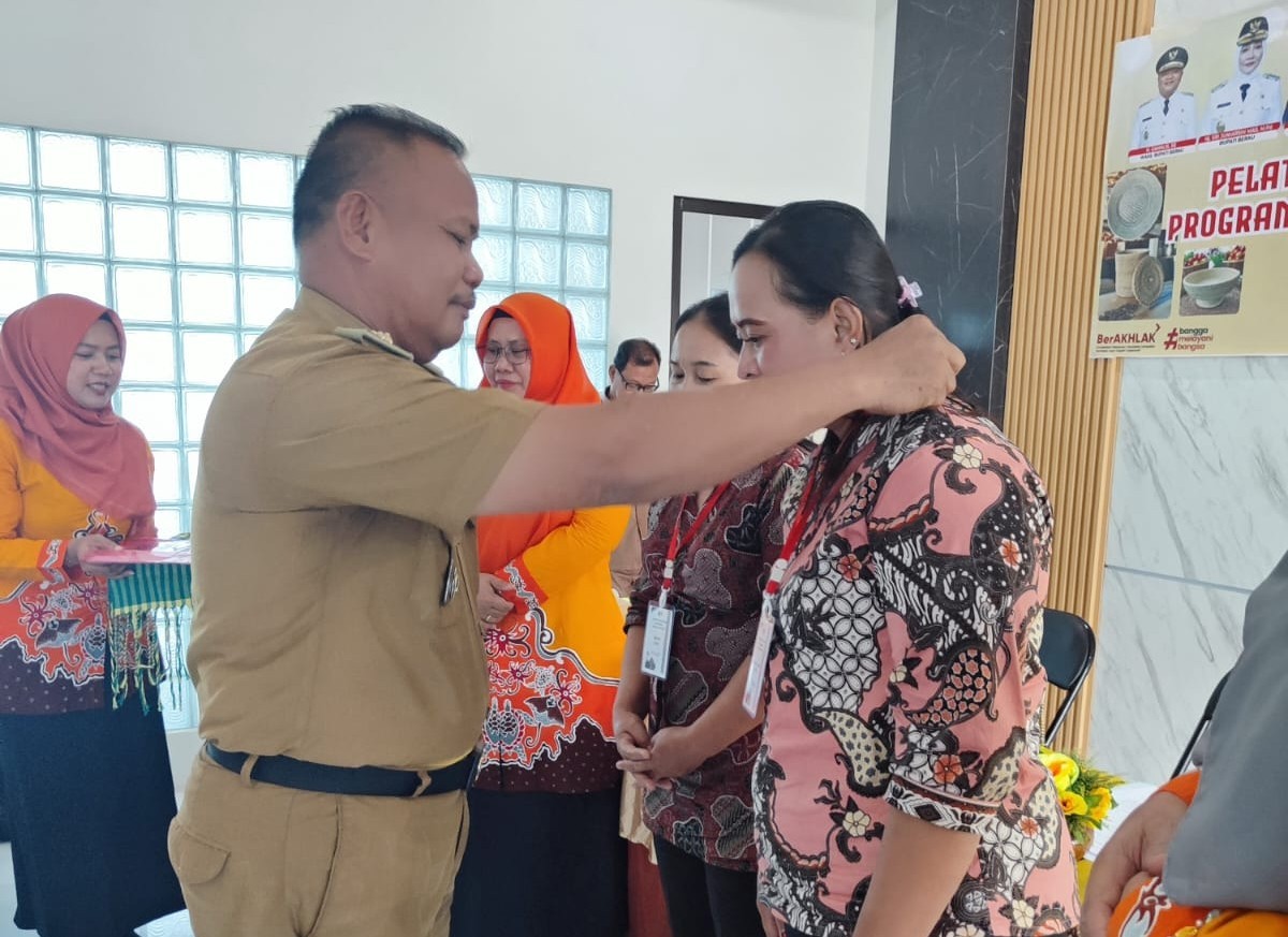 Camat Segah Toris menyematkan tanda peserta pelatihan anyaman rotan Kantor BKKBN Kecamatan Segah, Senin (20/4/2026). foto Kominfo Berau